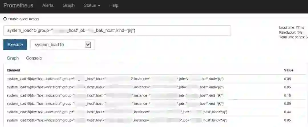 下图中以一个简单例子说明:该条查询可以看到某集群接口机15分钟内的系统负载,涉及到的标签维度为集群、主机IP、主机类型等。