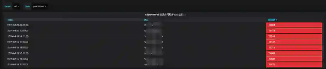 主要从cpu占用、内存占用、负载、线程数多个维度统计同一主机群体(如:A机房接口机是一个主机群体,B机房计算节点是一个主机群体)占用资源最多的前十台机器。