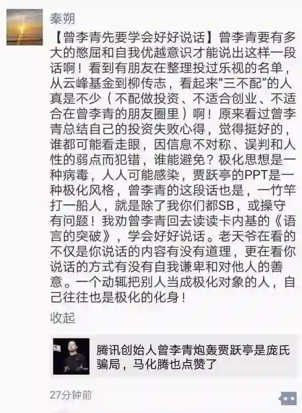 孙宏斌抬头找了半天,没看见仙踪啊。低头在手机里翻了翻,原来是腾讯的五位创始人之一曾李青,发了个帝君附体的朋友圈,说不跟这些人做朋友了。