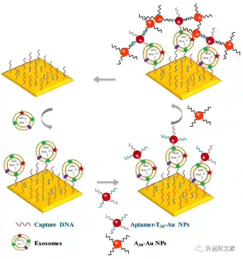 首先,用捕获DNA功能化Au膜,并通过直接测量检测靶外泌体。然后加入适体/ T30连接的AuNP,并通过单个AuNP扩增的SPR适体传感器检测靶外泌体。最后,通过两个互补序列(T30和A30)的杂交,可以在适体/ T30连接的AuNP上捕获A30包被的AuNP,并且通过双AuNP扩增的SPR适体传感器检测靶外泌体。进行AuNP辅助的信号放大,检测低浓度的外泌体。该方法为灵敏外泌体检测提供了有效途径,是生物学和临床研究中应用的有前途的技术。