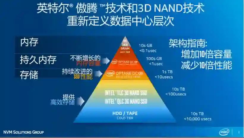 Intel 在运用创新的 3D Xpoint 技术打造了两款产品,一个是数据中心持久化内存,DCPMM,用于填补内存容量的差距。另一个是傲腾 SSD,用于存储端的存储级内存 SCM,解决存储端性能差距,而存储端的容量需求则会由 TLC 和 QLC 的大容量的 NAND SSDs 去满足。