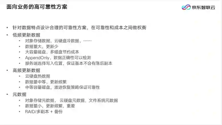 一般来说,可靠性都具有一个特点,即数据更新的越频繁,保证可靠性,需要花的代价就越大,所以京东会将数据进行分类,如上图所示第一类是低频更新的数据,如对象存储的数据,这些数据一般具有数量大,更新少的特点。