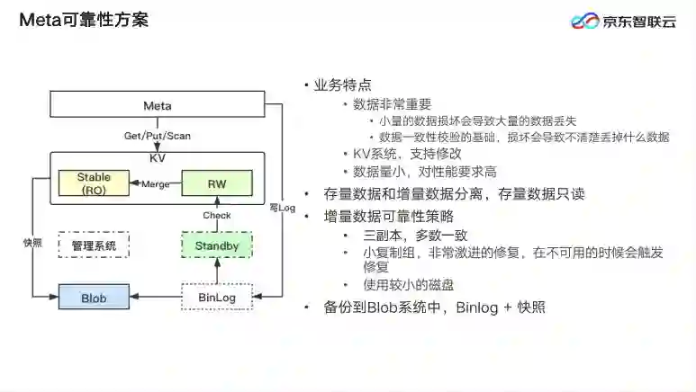 以上就是京东智联云在 Blob 系统中做的一些改变、优化措施,这也是京东智联云高可靠存储系统的核心部分,接下来简单的讲解下 Meta 可靠性方案和云硬盘的可靠性方案。