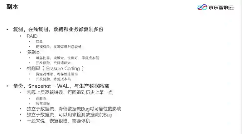 这些问题该如何解决呢?先说副本问题,在此之前先引入一个概念—冗余,冗余常见的形式分为两种:第一种是复制,如 RAID、三副本、EC 等其本质都是复制,它和我们在线的业务系统是绑定在一起的,其特点为复制的数据可以实现在线实时的进行写入和读取;第二种是备份,它是和生产的系统是隔离的,与复制不同的是备份会把所有的操作、所有的数据全部记录下来,在数据恢复时可以恢复到任何一个时间点的状态。通过备份的形式可以减少由于操作失误带来的损失。不过备份也存在一个问题,就是其读取和恢复速度都特别慢,动辄就好几个小时,时间成本较高。