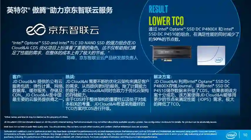 在未来 Intel 还会继续与京东一起开发更多的一些使用场景,如通过傲腾以及 QLC 的 NAND SSDs 组合提高性能,并改善整体的 TCO。