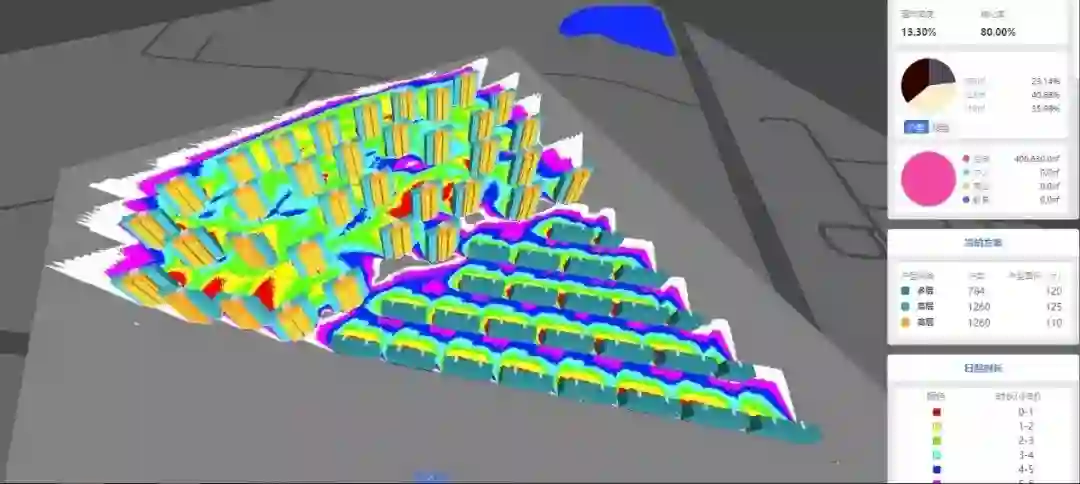 输入容积率、日照时间、绿化覆盖率等基本限定条件,系统能够智能审图,实时生成三维建模,极速完成每个指标的审核;设计师还可将区域进行不同功能划分,实时反馈楼栋数量,快速判断不同产品在基地上的楼栋数,以及与目标容积率的关系。