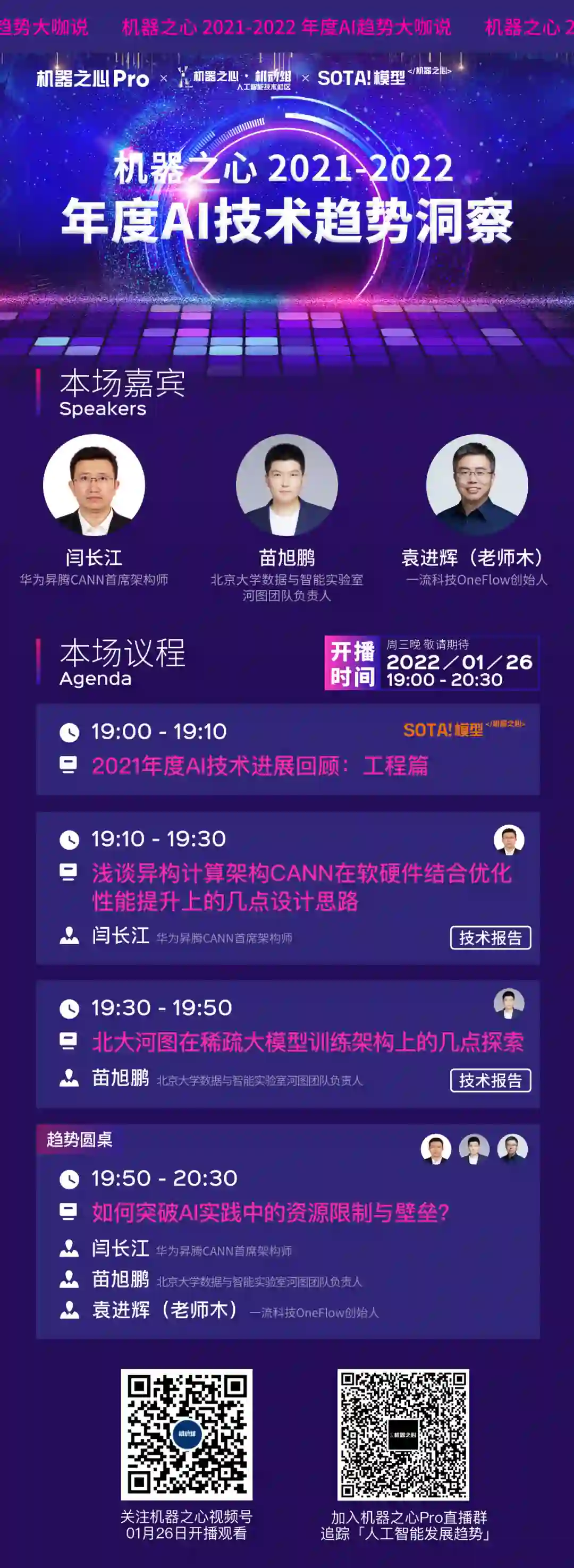 2022 年 1 月 24 日(周一)至 1 月 28 日(周五)每晚 7 点至 9 点,近 20 位高校教授、技术专家及技术企业高管将做客机器之心「2020-2021 年度 AI 技术趋势洞察」直播间,共同探讨「通往第三代人工智能的理论之路如何走?」、「通用(大)模型的最后一公里」、「如何突破 AI 实践中的资源限制与壁垒?」、「构建元宇宙基础设施的 AI 技术」和「通向可信人工智能的技术路径」五个与 AI 技术人息息相关话题,洞察 AI 技术在「AI 算法理论」、「ML 模型架构」、「AI 算法工程化」及「热点 AI 应用技术」四大方面的发展趋势与潮水所向。关注机器之心机动组视频号,1 月 24 日晚 7 点开播!