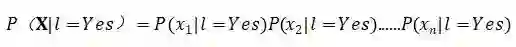 我们注意到X是个向量,它包含了每个特征的取值,于是我们可以将P(X|l=Yes)视为各个特征取值的条件概率下的联合概率,如果我们继续假设特征之间互相独立,那么联合概率就变得非常容易计算: