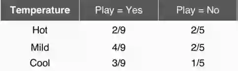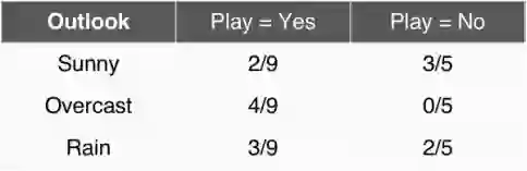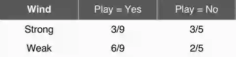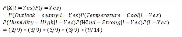 可以看出,类别l只有Yes和No两种情况。如果我们的测试样本X为(天气=Sunny,温度=Cool,湿度=high,风力=Strong),我们要分别计算出P(l=Yes|X)和P(l=No|X),然后比较大小,然后将概率大的那一方所选择的类别当作我们预测的结果。