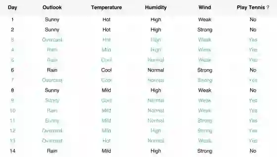 假如我们面临的问题是,根据天气、温度、湿度和风力4个特征来预测要不要去打网球,我们训练样本如下图所示: