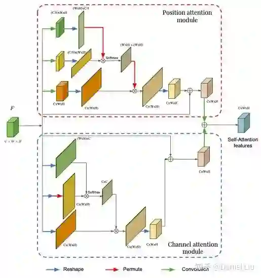 position attention module part:用于捕获长距离的依赖,解决局部感受野的问题。
