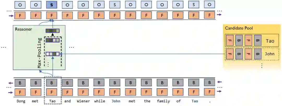 具体来讲,每一层都独立完成一次 NER;每层的 NER 结果,会通过一个符号化的「缓存」存储起来,作为下一层 NER 的参考;这种参考是通过一个交互式的池化神经网络来实现,它其实是一个基于多个事实的推理模型。通过这样的设计,在做每个局部的决策时,模型都可以「看见」目前识别出的所有实体信息并参考别处相关决策,从而做出更加明智的决定。