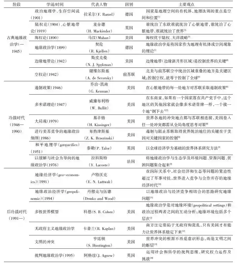 地缘环境是地缘主体(国家、组织)生存发展的外部环境的总称,是国际上各类地缘事件的载体,既包括自然地理基础,也包括人文社会条件。对地缘环境特征和演变规律的研究是认知国际地缘政治态势、实施保障国家安全的重要手段。地缘环境研究缘于人们对地理要素作用的基本认知,即全球或地区政治、经济格局的形成和发展受地理条件的影响和制约。中国先秦时期,孙武为代表的兵家和鬼谷子为代表的纵横家分别阐述了地缘环境对军事行动和政治活动的影响和制约;《三国志》之《隆中对》中诸葛亮对局势的判断和荆州、益州发展方向的选择,则是基于政治、军事、资源和文化等诸多因素的综合考量。西方的地缘环境研究可追溯到亚里士多德、孟德斯鸠、康德等。1899年,德国科学家鲁道夫·契伦首次提出地缘政治学(geopolitics)的概念,认为地缘政治学是将国家作为地理有机体或空间现象的理论。地缘政治学起源与发展的基本情况如表1所示。