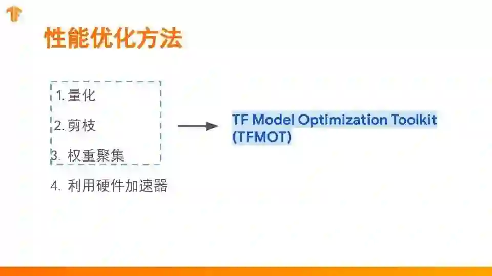 第七集中我们将介绍模型优化工具包中包含的多个模型优化工具,比如量化,剪枝和权重聚集。使用模型优化工具包我们可以大大提高模型的性能,减小模型的大小: