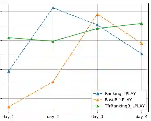 2. 在LPLAY指标上,TfrRankingB优于Ranking,Ranking优于BaseB。