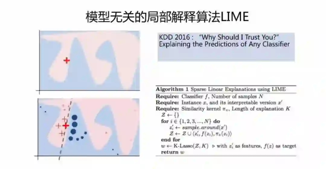 那么问题来了,可解释的模型一般非常简单比如线性模型,它无法去拟合像 DNN 这样一个非线性模型,例如上图的这个分类结果,这篇论文给出了一个很新颖的算法 lime ,因为无论模型多么复杂,每次也只需解释一个样本的预测结果,而非线性模型在单个的样本的局部是可以用线性模型近似的。