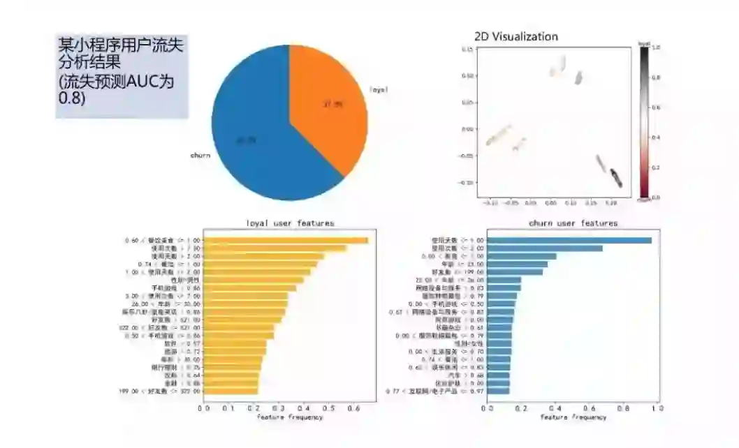 这是我们对一款游戏类小程序的用户流失分析结果的可视化展示,可以看出主要是学生用户正在流失可能是由于最近快期末考试了,我们还可以对这些用户进行聚类,上图右上角是在二维平面上的可视化聚类结果,使用者还可以再次下钻到各个子类中针对各个类的特点制定相应的运营策略。