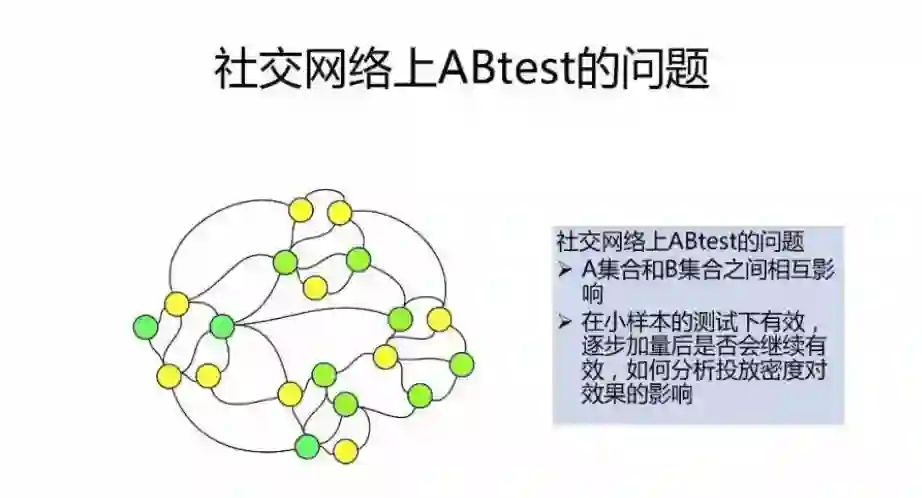 之所以叫 ABtest 是因为在实验时会将实验的用户分流成不使用策略的 control 和使用策略的 treatment 两组用户进行对比观察,这里有很多技术细节比如在多个实验并行进行时的正交分层模型,对 control 和 treatment 的同质校验,结果的显著性分析等,有很多论文讨论这些问题。我这里重点和大家一起交流一下在社交网络中的一些问题和改进方法。