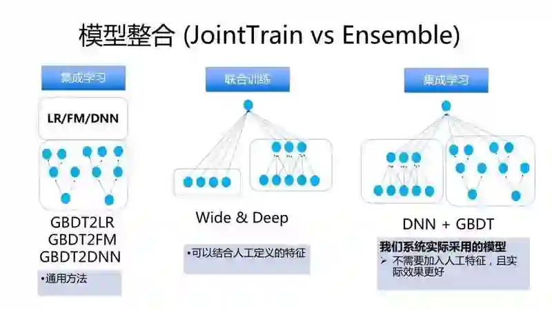 如果人工特征设计得好是可以结合两者优点取得非常好的效果的。我们系统实际使用的是上图右边这种 ensemble 的方法,因为 gbdt 是一种基于 boosting 的学习框架,那么理论上它可以 boost 任何模型,当然包括 dnn ,这样就可以将这两种模型的优点结合起来了。