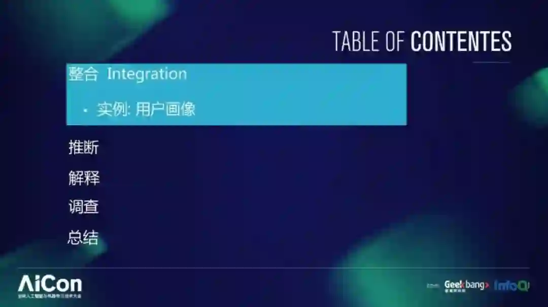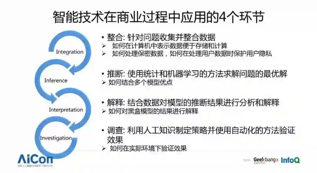 我们来看一下智能技术在商业过程中解决问题的 4 个重要环节,我这里总结了 4 个“ in ”,首先我们叫 integration ,就是针对需要解决的问题收集和整合已有的数据。