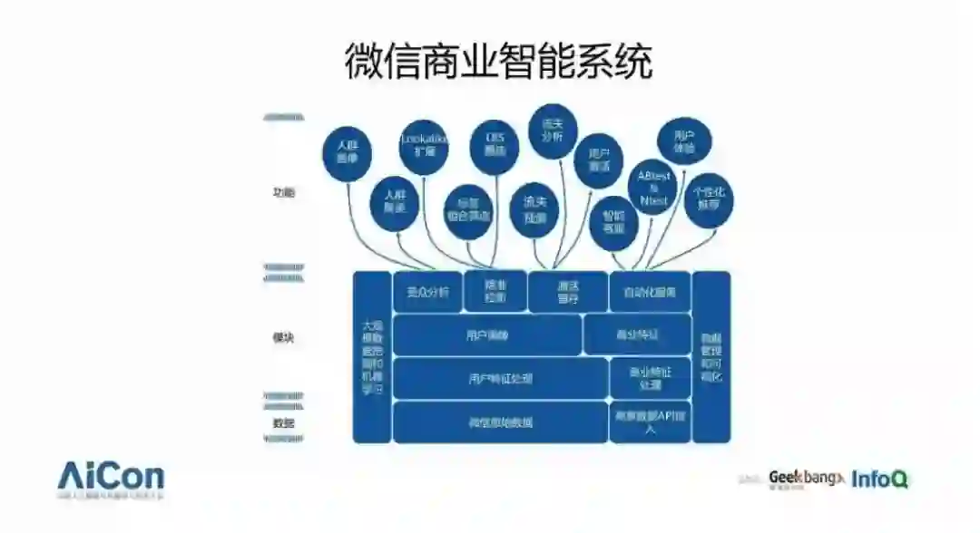 今天我将结合其中的用户画像,流失预测,流失分析和 ABtest 相关技术和大家一起探讨一下微信在商业智能技术 4 个“ in ”上的技术实践。