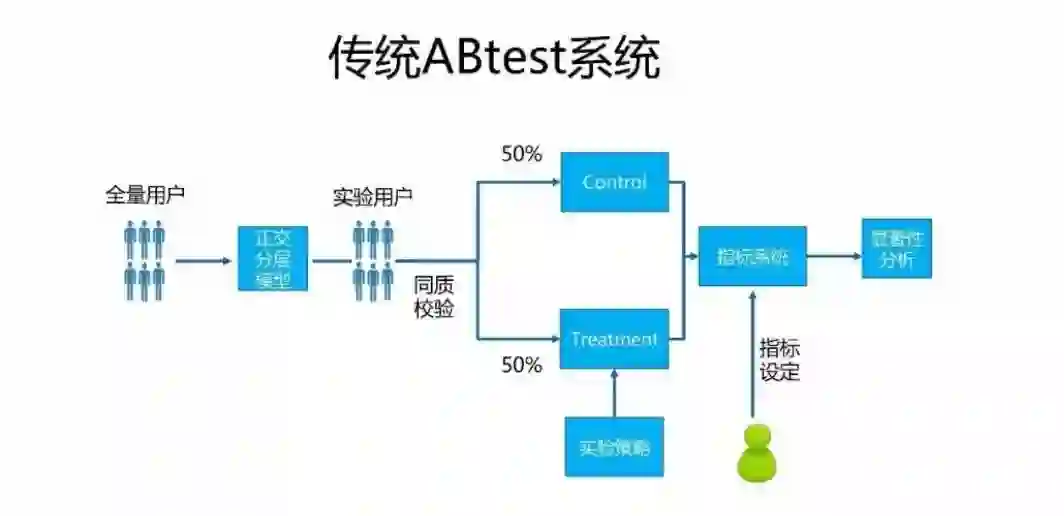 比如刚说的流失问题,我们分析问题后设计了一个降低流失的策略,要看这个策略有没有效果就要放到线上的真实环境中去测试,这是传统的 ABtest 的流程。
