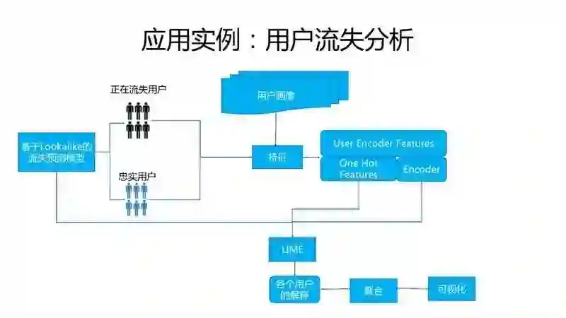 这是用户流失分析系统的框架,通过前面说的模型进行用户流失预测后得到了正在流失的用户和忠实用户,这里需要注意的是我们对用户特征做了 encoder ,所以在解释的时候需要映射回之前可解释的特征表示并和编码器一起传给 lime ,就可以对每个用户的流失预测结果进行解释了。