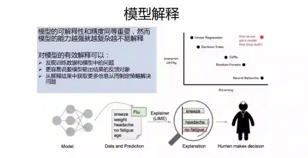 那么有没有一种方法可以同时得到比较高的精确度和可解释性呢?这其实是个鱼和熊掌的问题,因为模型的能力越强就越复杂越不容易解释,右上这个图说明了这种情况,横轴是模型的精确度,纵轴是模型的可解释性,可以看到可解释性很好的线性模型和决策树模型精度并不高,精确度很高的神经网络和深度学习解释性最差。