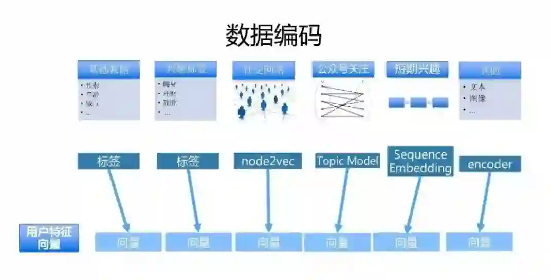 公众号的关注关系其实是一个稀疏矩阵,我们把每个用户关注的公众号作为一个词,把一个用户作为一个文档看待,这样就可以使用通用的主题模型给每个用户打上主题标签,推荐大家使用袁老师的 lightlda ,非常适合大规模数据的训练,还有短期兴趣这种序列结构,文本,图像这些数据都可以用深度学习的方法 embedding 成向量,那么最终把这些向量拼接到一起就是计算机可以使用的用户特征向量。