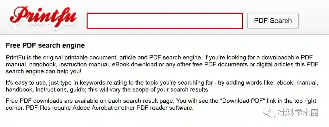 PrintFu是可打印的原始文档、文章和PDF搜索引擎。网站容易使用,输入关键字就可以检索资源,包括电子书、手册、手册、说明、指南等,都可以免费下载。在检索页的右上角,就有“下载PDF”链接。