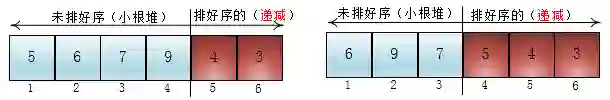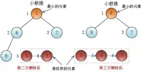 如果将这个数组调整为小根堆,那么根据小根堆堆顶一直是最小元素的特性,我可以不断地取(删除)堆顶的元素,直到堆中只剩下一个元素,这样就可以得到一个递减的元素序列了