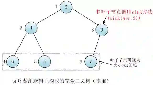 每个叶子节点可以视为一个大小为一的堆,我们可以自底向上从非叶子节点开始每层从右至左给每个节点都调用下沉(sink)方法,这样以当前节点为根节点的树就变为堆了
