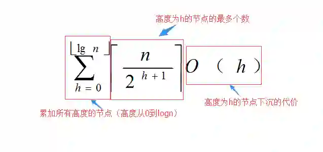 建堆的时候时间消耗在下沉操作上,而下沉操作最多下沉到底,显然,高度为h的节点下沉代价为O(h)