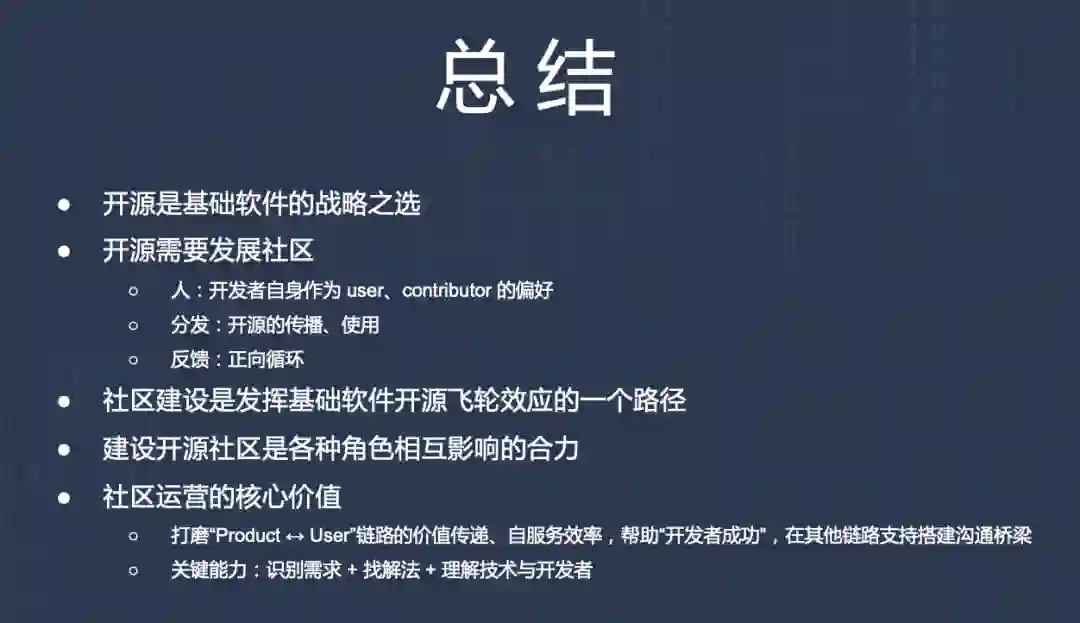 最后用这张图做一个小小的总结,开源社区的运营、开发者关系是有趣也比较庞杂的话题,今天所聊到的也只是截取了一些局部的点,而且是基于有限的认知和探索,在这里抛砖引玉,谢 InfoQ DIVE 提供的交流机会:)