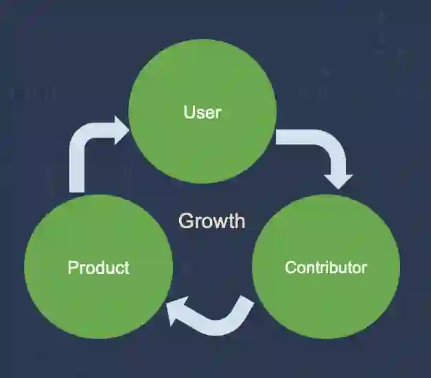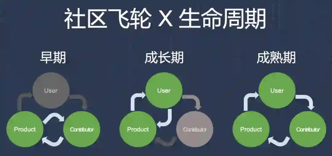 在项目早期,产品通常还是比较基础的状态,可能还没有什么用户,从长期发展的角度而言,这一阶段最关键的是验证和完善产品。早期的贡献者也通常是基于对产品技术本身的兴趣而加入,这也是为什么在图示中,存在双向的箭头。