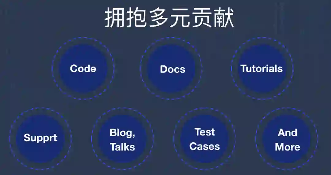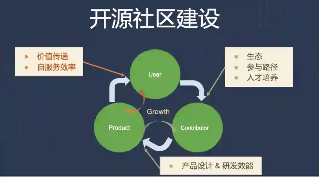 这里我们所称的“社区”,并不是狭义的贡献者社区,而是把我们的产品、贡献者、用户都视为社区的一部分,彼此之间相互影响,像一整个生态,而这个交互过程中的效率、质量都在影响着社区的成长。而“Contributor”也不仅包括代码贡献者,也包括了社区对文档、文章、答疑、布道等方面做出贡献的成员们。