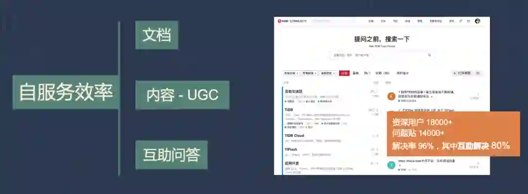 TiDB 社区的自服务,主要是通过网站来实现的,除了文档主要由我们的工程师撰写,其他的技术文章、互助问答,社区用户参与的程度在稳步提升,今年 3 月我们对社区 1 万多个问答贴子做了个统计,其中已有 80% 是由社区用户互助解决的。