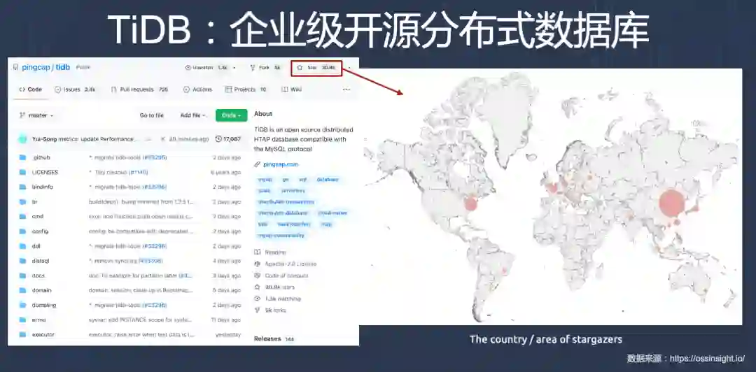 说到为什么一定要开源,我们先回归到开源是什么——它既是一种软件的“生产”方式,也是一种“分发”方式。在这个基础上,不难理解开源带来的力量:第一,开放本身即是一种构建信任的方式;第二,通过开源,让项目本身开放可获取,也可实现全球化的技术传播(从下图中给 TiDB star 的开发者分布情况可见一斑);第三,开源作为一种软件的生产和协作方式,能够让更多人直接参与产品的反馈、构建,大大加速产品的迭代。