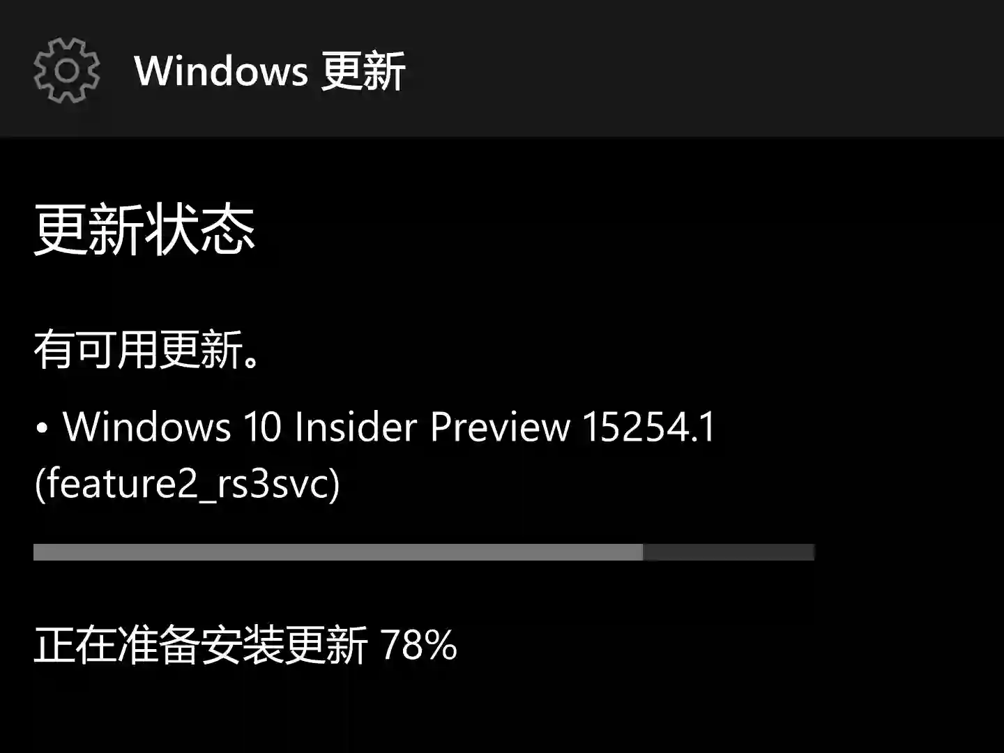 “有可用更新。——Windows 10 Insider Preview 15254.1(feature2_rs3svc)”
