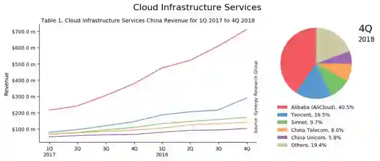 2017 Q1~2018 Q4中国云基础设施服务市场份额,来源:Synergy Research Group