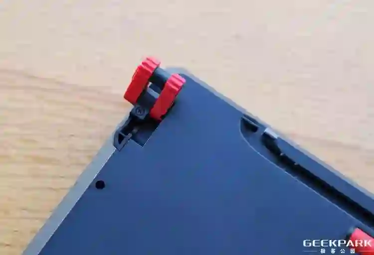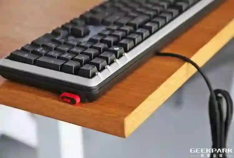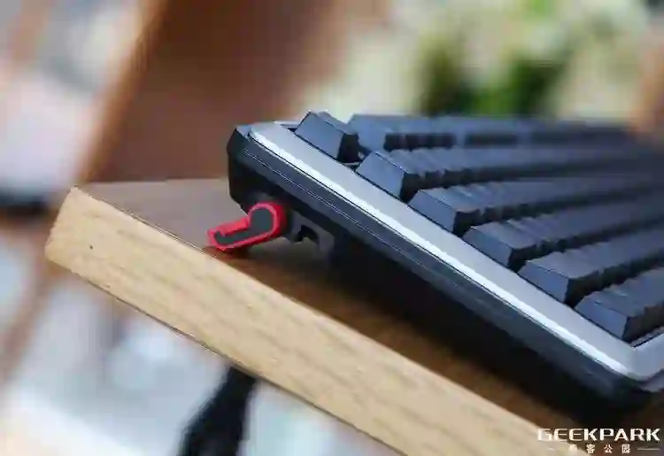 键盘底部左右各有一个红色支架。另外,除了其本身自带的支架之外,MX Board 5.0 还提供了一个非常大并且支持调节的掌托,按照官方的描述,其与独特的支脚搭配,可以实现 9 种不同的姿势状态。
