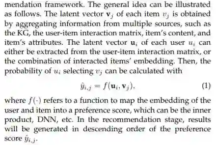 基于嵌入的方法使用KGE方法对KG(项目图或用户-项目图)进行预处理,以获得实体和关系的嵌入,并将其进一步集成到推荐框架中。然而,这种方法忽略了图中信息的连通性模式,很少有文献能够给出有原因的推荐结果。基于路径的方法利用用户-项图,通过预先定义元路径或自动挖掘连接模式来发现项的路径级相似性。基于路径的方法还可以为用户提供对结果的解释。将基于嵌入的方法与基于路径的方法相结合,充分利用双方的信息是当前的研究趋势。此外,统一的方法还具有解释推荐过程的能力。