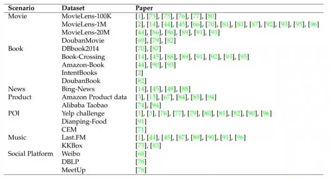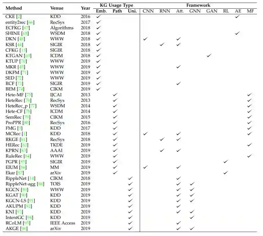 图4 收集论文表。在表格中,Emb代表基于嵌入的方法,Uni代表统一方法,Att’代表注意力机制,’RL’代表强化学习,’AE’代表自动编码器,’MF’代表矩阵分解。