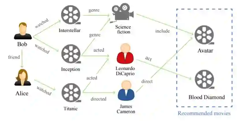 近年来,将知识图谱(KG)作为边信息引入推荐系统引起了研究者的关注。KG是一个异构图,其中节点作为实体,边表示实体之间的关系。可以将项目及其属性映射到KG中,以了解项目[2]之间的相互关系。此外,还可以将用户和用户端信息集成到KG中,从而更准确地捕捉用户与物品之间的关系以及用户偏好。图1是一个基于KG的推荐示例,其中电影“Avatar”和“Blood Diamond”被推荐给Bob。此KG包含用户、电影、演员、导演和类型作为实体,而交互、归属、表演、导演和友谊是实体之间的关系。利用KG,电影与用户之间存在不同的潜关系,有助于提高推荐的精度。基于知识的推荐系统的另一个优点是推荐结果[14]的可解释性。在同一个示例中,根据user-item图中的关系序列可以知道向Bob推荐这两部电影的原因。例如,推荐《阿凡达》的一个原因是,《阿凡达》与鲍勃之前看过的《星际穿越》属于同一类型。最近提出了多种KGs,如Freebase[15]、DBpedia[16]、YAGO[17]、谷歌的知识图谱[18],方便了KGs的推荐构建。