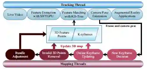 本文的主要贡献是作者提出了一种新颖的关键帧在线表示和更新方法以自适应对动态环境进行建模,从而使得场景的外观和结构变化可以被有效地检测和处理。作者通过将特征点从关键帧投影到当前帧,对它们的外观和结构的对比,进而可以可靠地检测出变化的特征。同时,因为遮挡所引起的外观变化也可以被可靠地检测与处理。其中,存在较大变化区域的关键帧将被重新选择的关键帧替代。