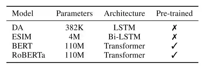 目前使用的语言模型(例如BERT)已经远远超过了resnet级别的卷积神经网络。这篇论文就探究了一下他们的ECE大概是什么情况,以及有哪些方法可以降低ECE。整篇文章选用了下图所示规模从小到大的四个模型,分别是带attention的LSTM(DA),经典匹配模型ESIM,BERT和Roberta。其中后两种是预训练语言模型,前两种模型不经过预训练。