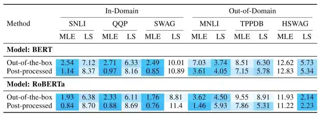 校准后的结果如下图所示。这个表格稍微有点复杂,首先每组任务分为ID和OD两种类型,每个类型又分为普通MLE训练和标签平滑后的训练两种方式,每种训练方式又分为后处理(post-processed)和不后处理(out-of-the-box)。为了方便大家阅读,作者给单元格图上了颜色,颜色越深说明ECE越小,即模型的校准性越好。