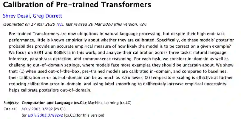 Calibration of Pre-trained Transformers: https://arxiv.org/abs/2003.07892
