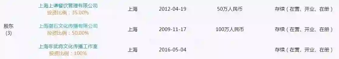 除了5家火锅店和3个服装品牌,为了经营自己的演艺事业,薛之谦还注册了上海非武将文化传播工作室和上海潮石文化传播有限公司两家公司。