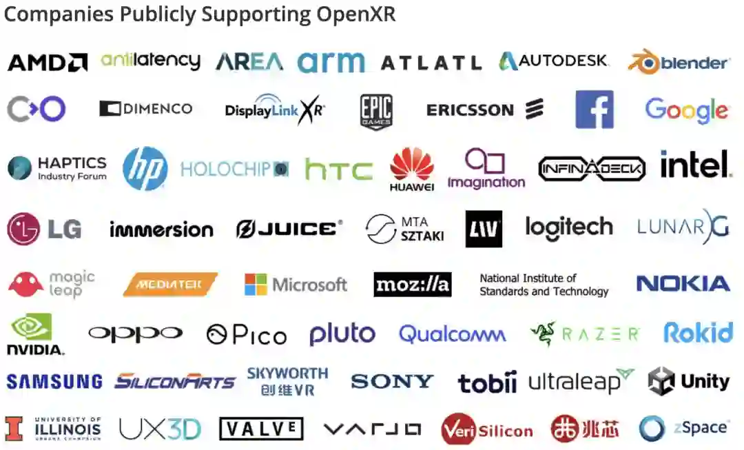 对于业界来说,OpenXR的出现相当于立起了一杆大旗。目前,OpenXR标准获得了包括AMD、Meta、谷歌、英特尔、微软、英伟达、高通等计算机软硬件和内容领域巨头的支持。